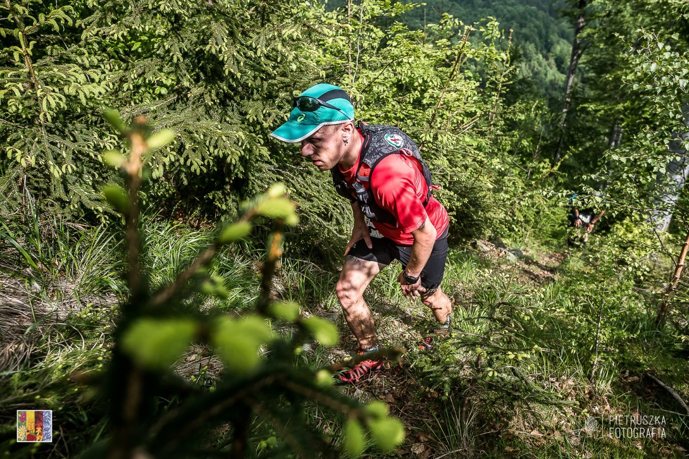 No, ale nie przestała. „Najwyżej będę się oszczędzał” mówię sobie przed biegiem z pełną powagą. W ogóle ostatnie dni przed startem spędziłem głównie na przygotowaniu psychicznym i mentalnym do biegu, polegającym z grubsza na powtarzaniu sobie jak bardzo mam przejebane. Chyba dzięki temu ruszam jak na siebie naprawdę zachowawczym tempem, co owocuje w miarę bezbolesnym wtargnięciem na Skrzyczne. A skoro idzie tak gładko, to czemu by kapkę nie podkręcić tempa? Początkowo zbieg jest stosunkowo łagodny, z lekką nutką kamieni, by nagle przejść w stromiznę z poprzewracanymi drzewami, gałęziami, chyba nawet jakimś strumieniem czy innym ciekiem wodnym nieułatwiającym bynajmniej bezpiecznego przemieszczania się w dół. No w każdym razie lekko nie jest, za to jest ślisko i kamieniście i w ogóle. Niemniej biegnie mi się całkiem dobrze, po chwili zaczynam nabierać coraz większej wprawy w omijaniu przeszkód i nawet wyprzedzam kilka osób, więc może nawet coś z tego będzie? Na dole okazuje się jednak, że chyba troszkę przesadziłem, gdyż nogi zaczynają mi się odrobinę telepać i kiedy fotograf krzyczy do mnie żebym chyżo skakał przez strumień, mimo iż robię co mogę, czuję jakby mi ktoś doczepił ciężarki do nóg, co na ósmym kilometrze zdecydowanie nie jest dobrym zwiastunem. Sytuację odrobinę ratuje najbliższe podejście, które jest tak ciężkie, że wszyscy posłusznie idziemy wąską ścieżynką, rządkiem niczym kaczuszki, smagani niedelikatnie przez okoliczną roślinność igliwiem i kolcami po odsłoniętych częściach ciała. Nikt tu raczej nie myśli o wyprzedzaniu, wszyscy zastanawiają się jakim cudem idąc tak długo nie zrobiliśmy nawet 100 metrów (co jeszcze wiele razy na tej trasie powróci niczym deja-vu) i nie wiem jak reszta, ale ja zacząłem już odliczać metry do punktu odżywczego. Na zbiegu szarżuję tym razem racjonalnie, tak żeby dać oddech nogom, ale i za dużo nie stracić. Na 11 kilometrze docieram do punktu, a że jest on zarazem pierwszym jak i ostatnim, ładuję w siebie wszystkiego po trochu, świadomy, że od tej pory będę skazany już tylko na żele (ble). Na koniec łapię jeszcze garść daktyli i daję sobie jakieś 100 – 200 metrów na rozchodzenie pochłoniętych wiktuałów.